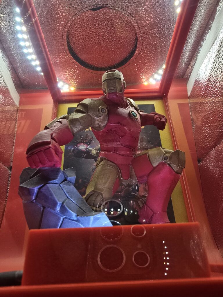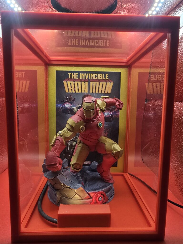 Il Nostro eroe prende vita dentro una teca luminosa, tra stampa 3D, verniciatura a mano e luce studiata per esaltare ogni dettaglio.